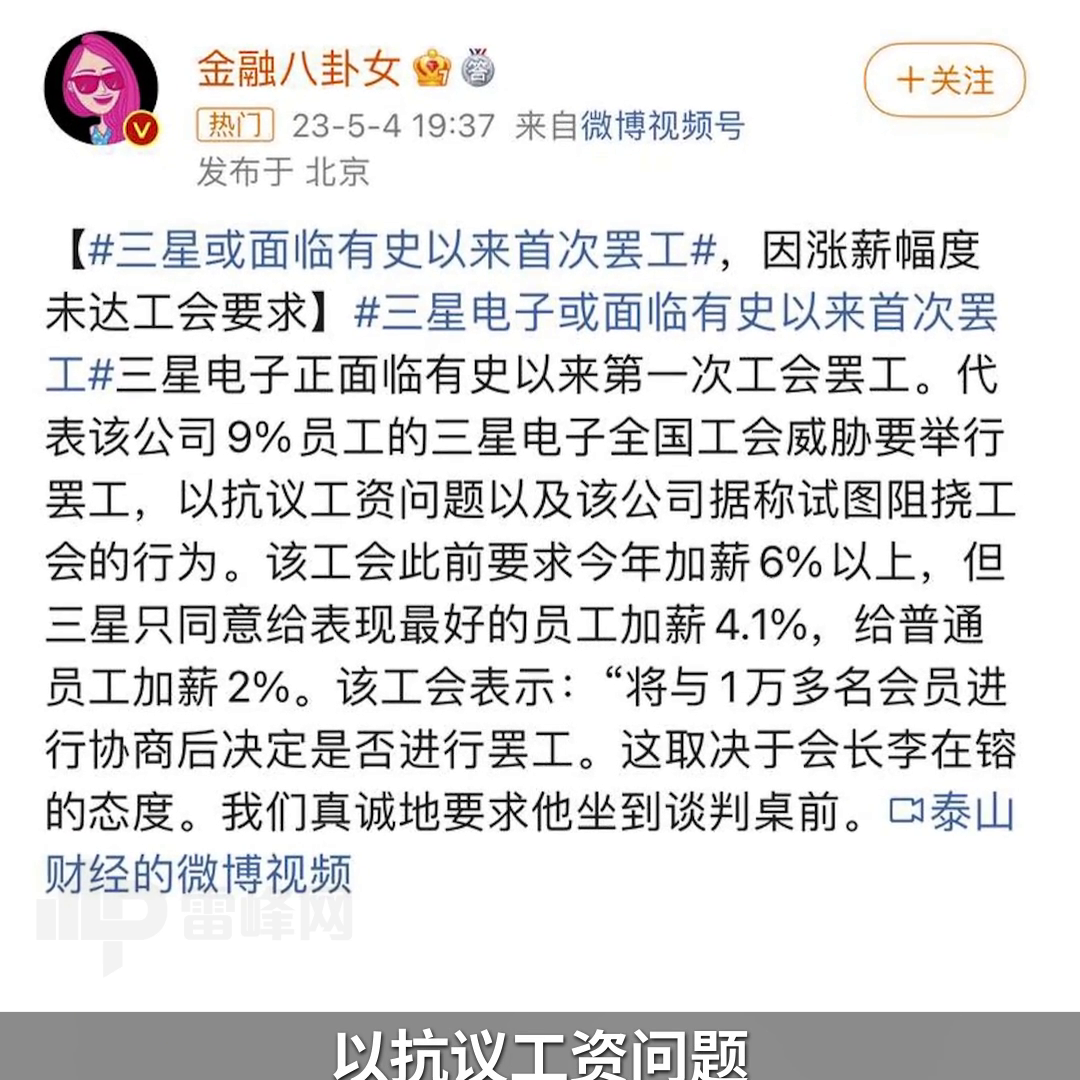 博主金融八卦女发帖:三星电子将面临工会罢工,以抗议工资问题,该工会要求今年加薪6%以上。但三星只同意给表现最好的员工加薪4.1%,给普通员工加薪2%。